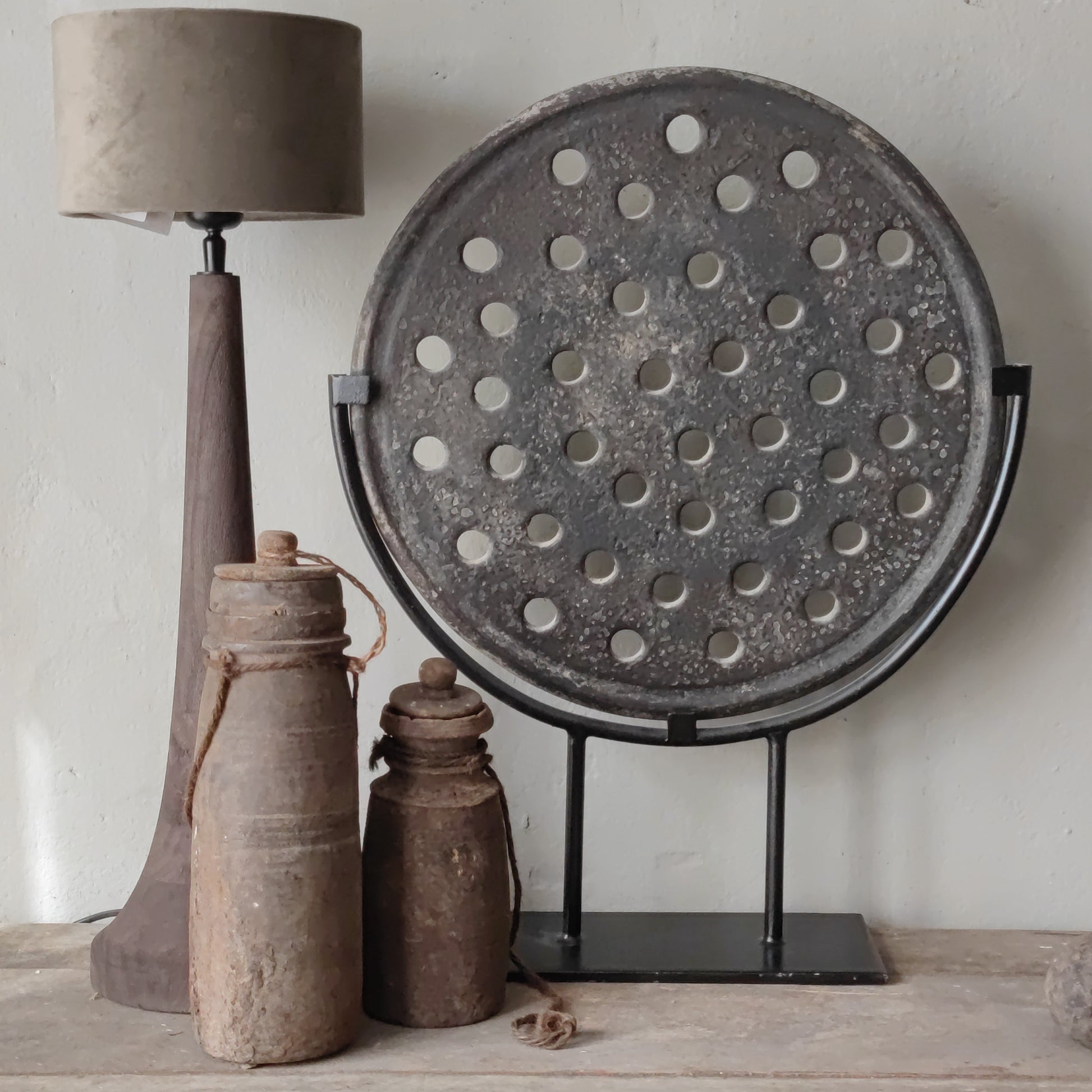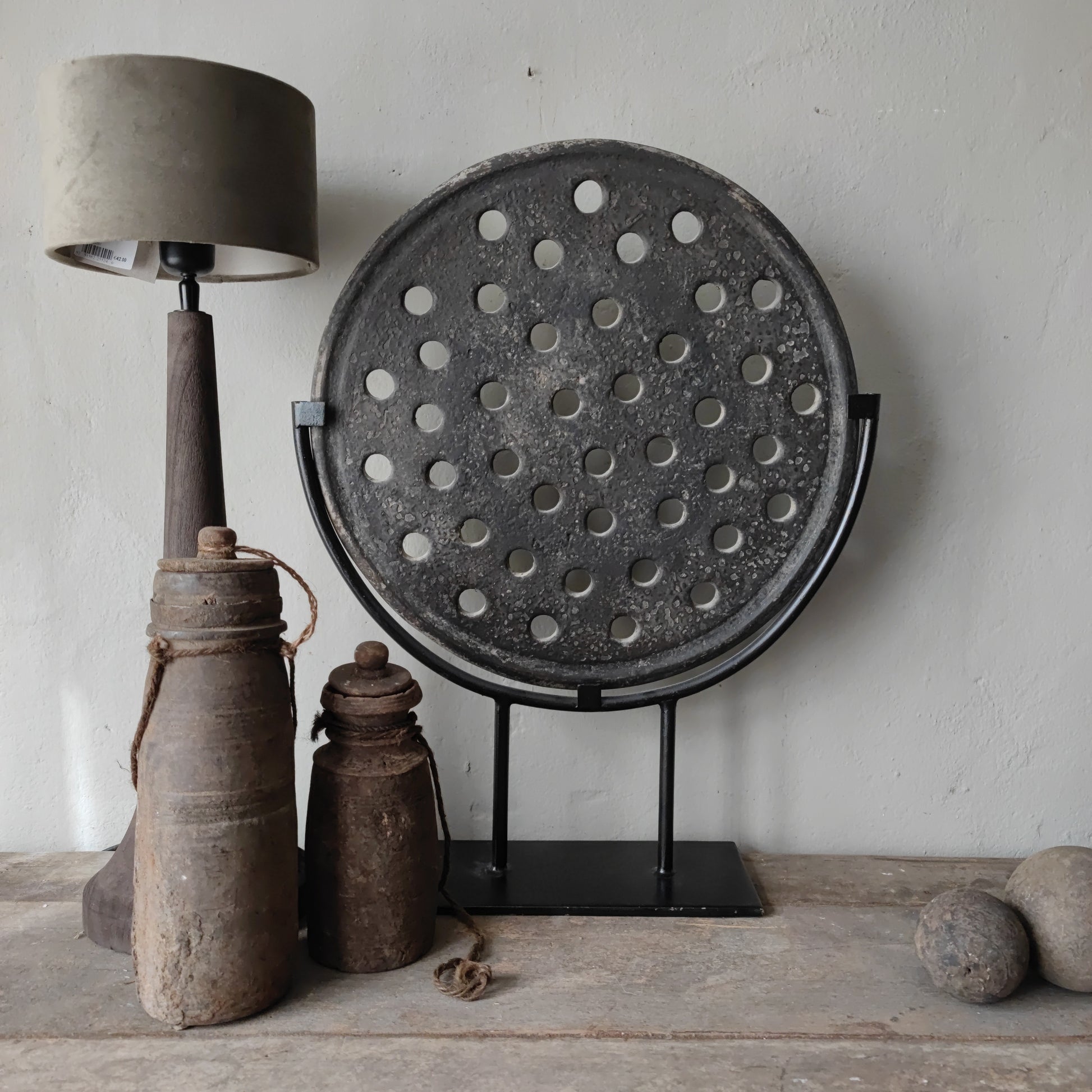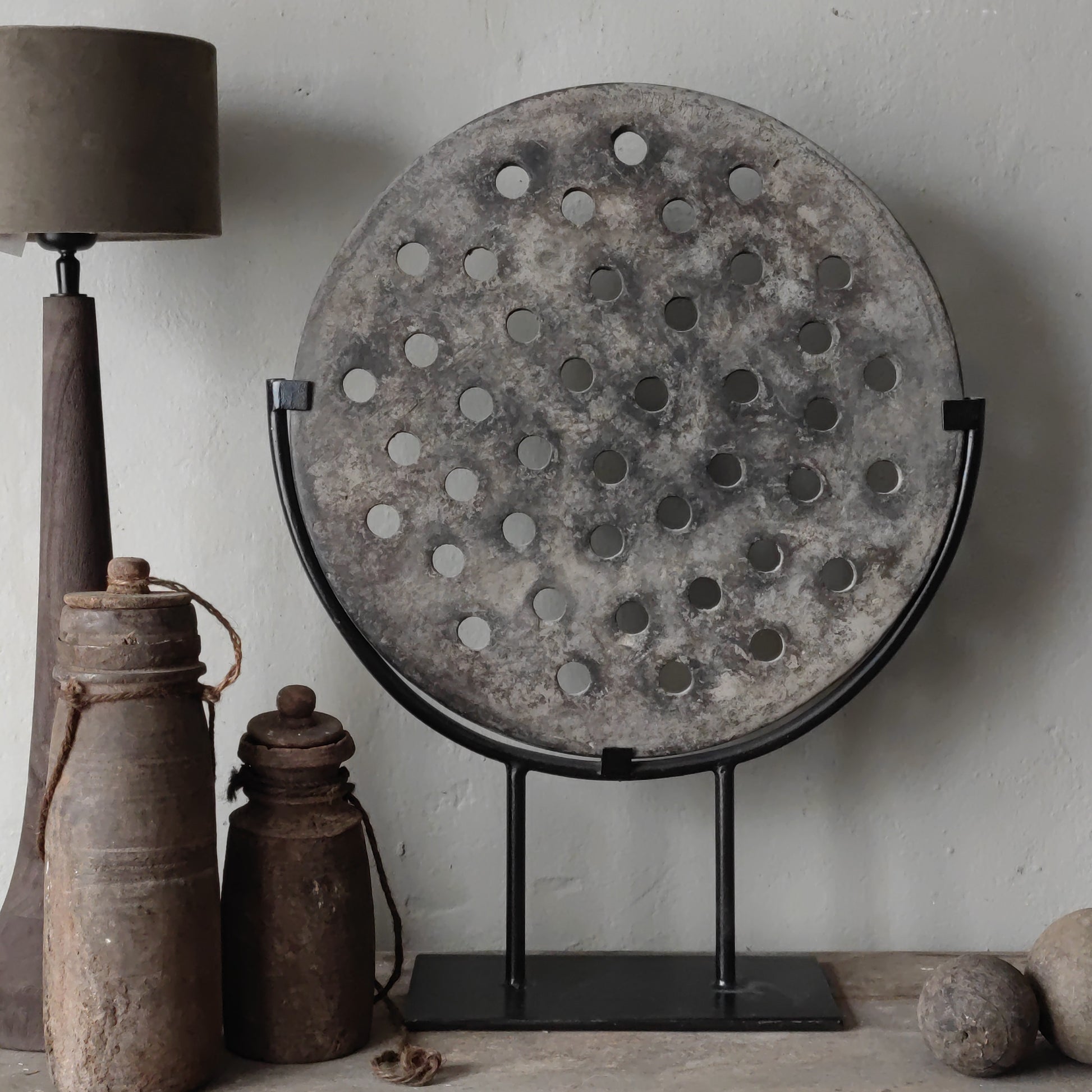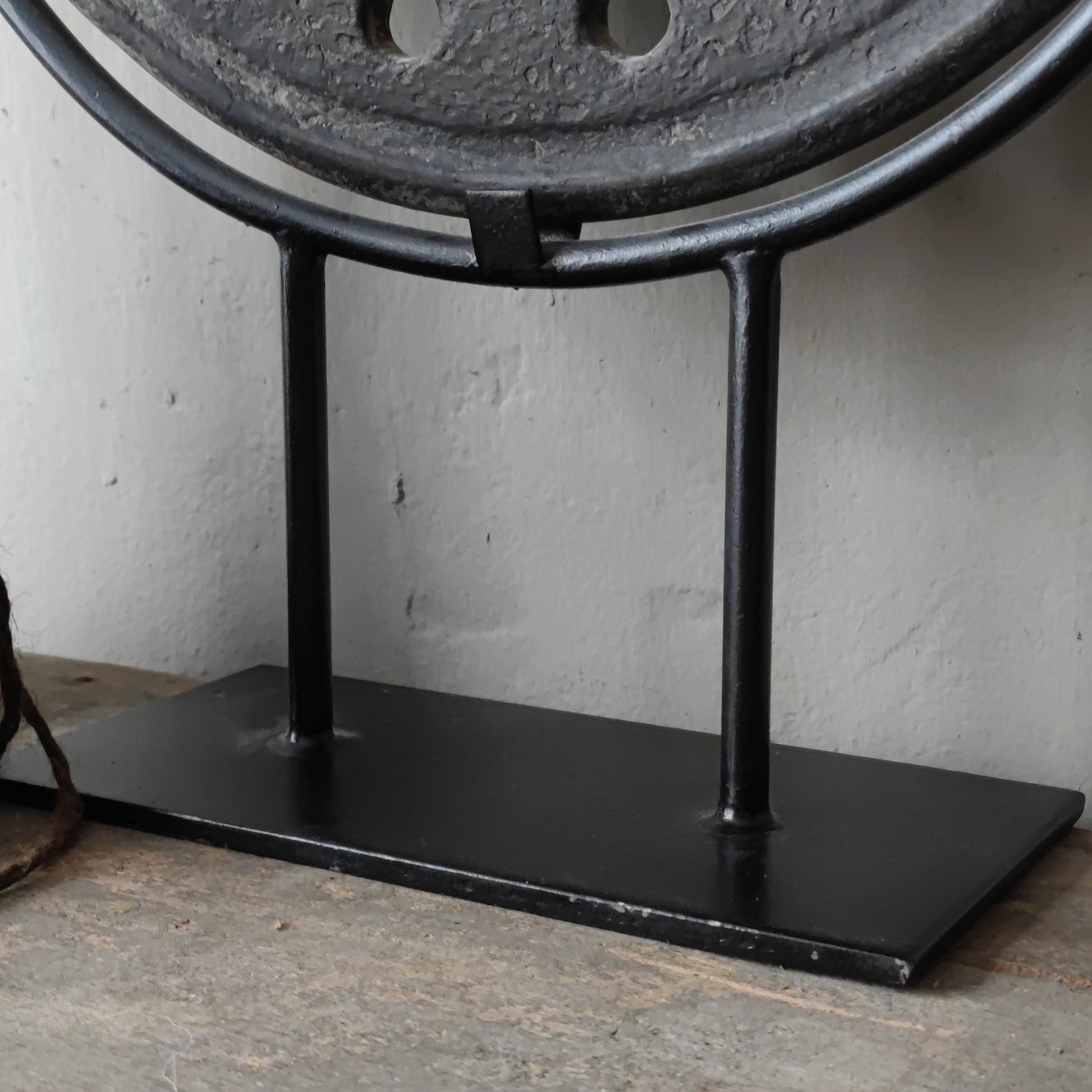 Prachtig is deze unieke oude steenmal op zwart metalen voet.
