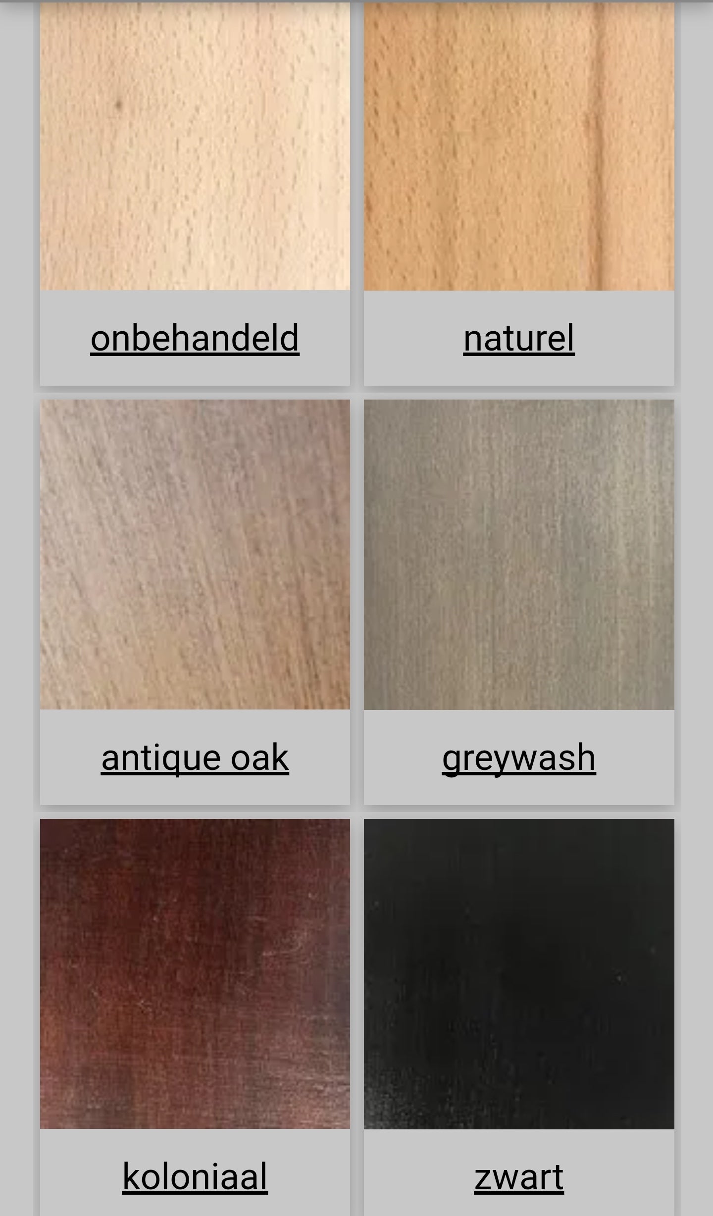 Pootkleur : onbehandeld / naturel gelakt / antique oak/ grey wash / zwart / koloniaal / bruin