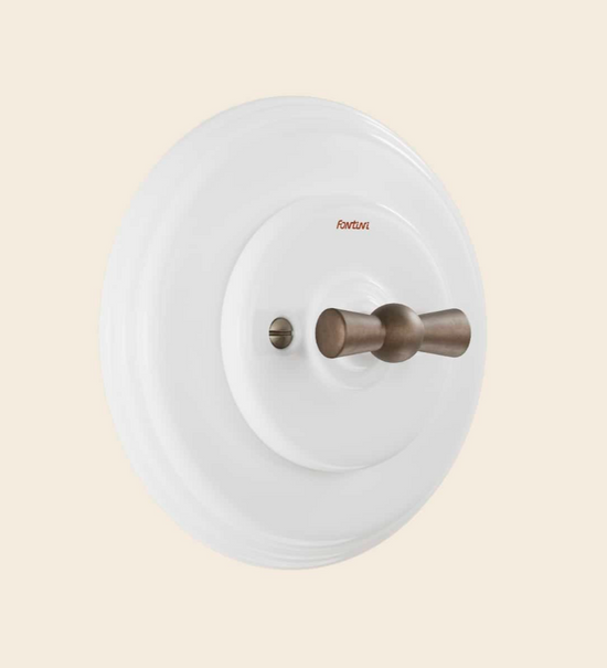 Inbouw, opbouw, met koord, buis met of zonder frame. In een breed scala aan verschillende porselein kleuren, knopjes of een druk schakelaar in hout brons of iets anders maar daar blijft het niet bij, want een USB, UTP, dimmer of andere kabelaansluiting vind je allemaal bij Fontini.