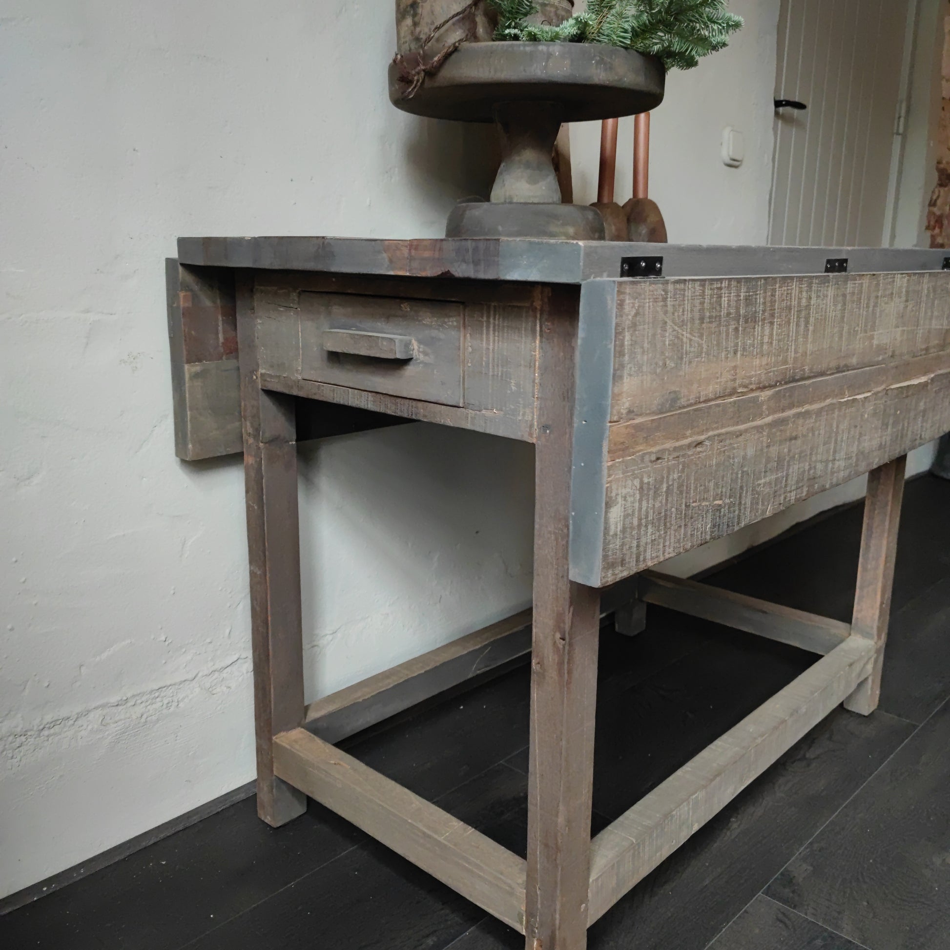 Deze prachtige klap tafel / sidetable is gemaakt van oud hout. Je kunt hem gebruiken als tafel, maar ook als sidetable, de tafel heeft 1 lade op de kopse kant zitten (alleen aan 1 kant)